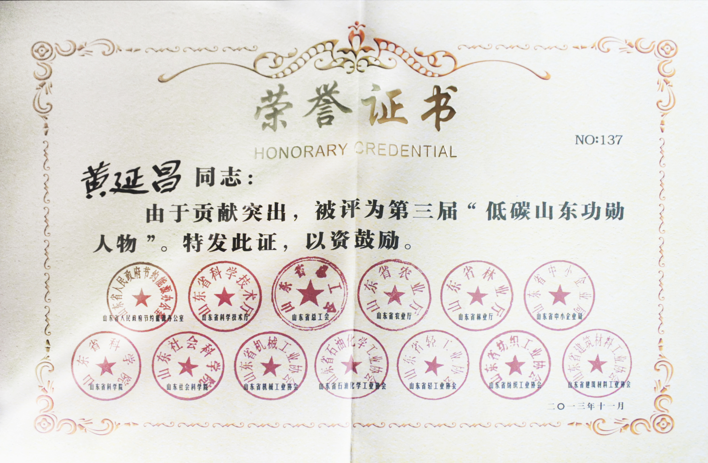11月27日第三屆(2013年度)低碳山東成果推介暨先進典型表彰大會在山東濟南南郊賓館隆重舉行,大會以“推廣低碳成果、促進綠色發展、共建美麗山東”為主題,對全省300多項優秀低碳成果進行推介,并對我省綠色低碳發展的先進典型進行了表彰。在經過推薦評選、資料申報、資格審查、評委會評審等程序后,我公司董事長黃延昌被評為第三屆“低碳山東功勛人物”。