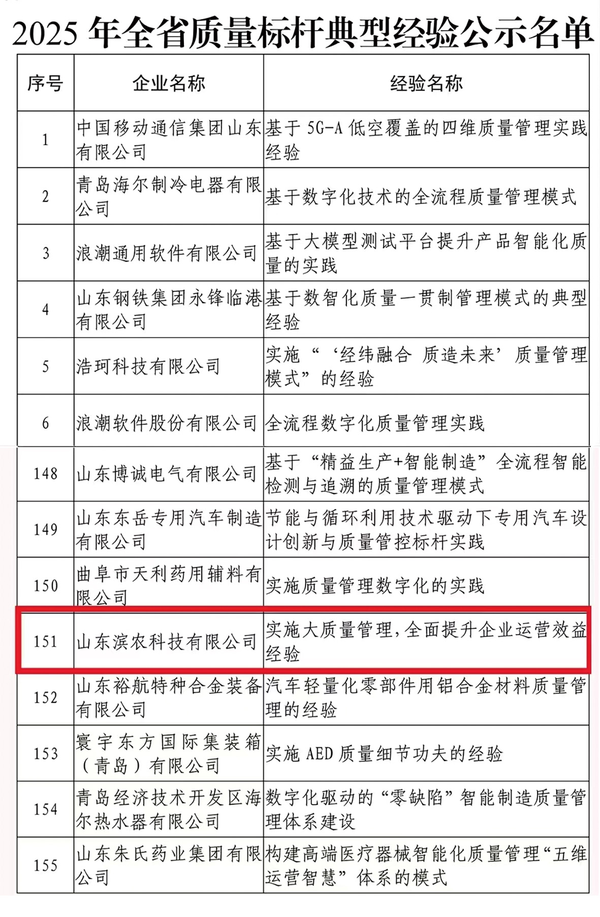 6月23日,山東省工業和信息化廳公布了2025年全省質量標桿典型經驗名單,我公司憑借“實施大質量管理,全面提升企業運營效益”的創新實踐成功入選。此次評選歷經企業申報、部門推薦和專家論證等多輪嚴格程序,全省共 155 家企業獲此殊榮,濱農科技作為農藥行業代表脫穎而出。