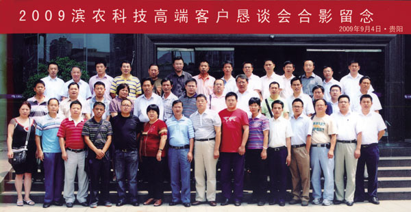 時(shí)間:2012-08-10 14:56秋高氣爽,天氣宜人,2009年9月4日至6日,濱農(nóng)科技董事長(zhǎng)黃延昌率銷售公司代表一行人員,與來自全國(guó)各地的32位高端客戶相聚在山清水秀的貴陽(yáng)市,就濱農(nóng)目前存在的問題及未來發(fā)展瓶頸進(jìn)行了廣泛而有益的交流,會(huì)議取得了圓滿成功。